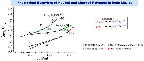 The scaling exponents of NaPSSin AmimClare completely different from those of NaPSSaqueous solution, which reflected the complex interaction between polyelectrolyte and ILs.